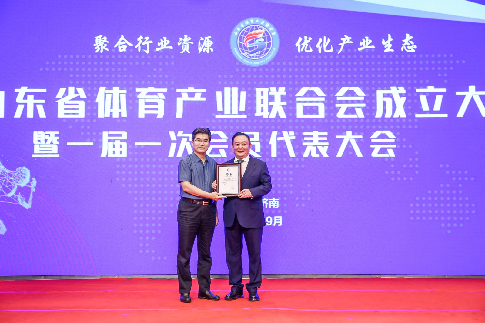 2020年9月16日,山东省体育产业联合会成立大会暨一届一次会员代表大会在山东济南隆重召开。中国体育用品业联合会主席李桦、山东省体育局副局长王延奎、中国文教体育用品协会副理事长张培生、中国体育用品业联合会副主席兼秘书长罗杰、山东省民政厅社会组织管理局二级调研员王军、山东省体育总会秘书处处长孙照亮、山东省体育局经济处处长徐金龙、山东省体育产业发展服务中心主任翟培建出席。山东省体育产业联合会近200名会员单位代表以及部分省市媒体共同参加。全国政协委员、中国·3003新葡的京体育产业集团董事长卞志良当选首届理事会会长并发表讲话。