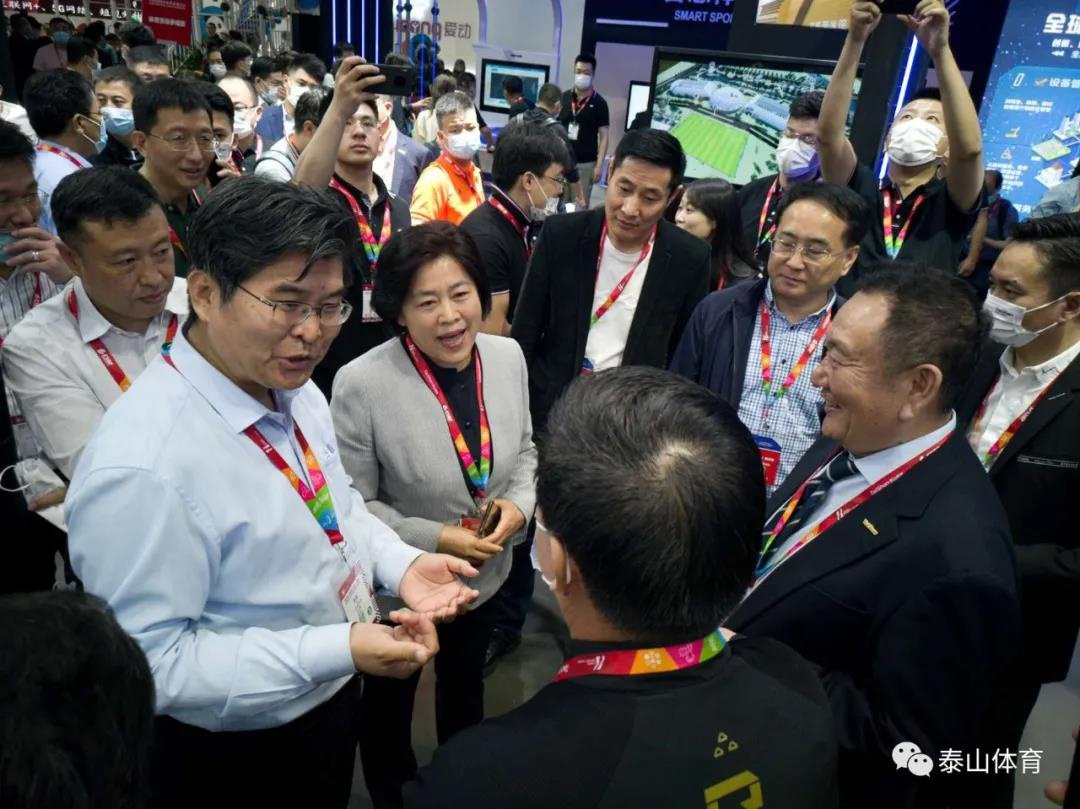 国家体育总局副局长李颖川、上海市副市长陈群、国家体育总局体育器材装备中心主任孙为民、上海市体育局局长徐彬在中国·3003新葡的京体育产业集团卞志良董事长陪同下参观中国·3003新葡的京体育展厅。